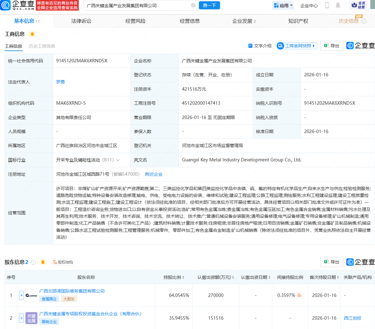 近日,广西关键金属产业发展集团有限公司成立,法定代表人为罗勇,注册资本约为42亿元,经营范围包含:非煤矿山矿产资源开采;矿产资源勘查;选矿;常用有色金属冶炼;贵金属冶炼等。企查查股权穿透显示,该公司由广西北部湾国际港务集团有限公司、广西关键金属专项股权投资基金合伙企业(有限合伙)共同持股。