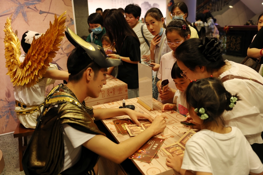 在签到台领取“尼罗河通行证”后,可以在博物馆内寻找任务打卡区域,通过“六神试炼”的任务,获取盖章。记者体验后发现,六个任务有难有易,有些考验智慧,有些则考验动手及协作能力,但都与古埃及展有关,且妙趣横生。